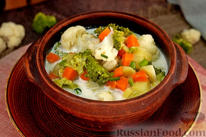 Рецепт Вершковий суп з цвітною капустою і броколі, склад: капуста цвітна, капуста броколі, картопля, морква, вершки, сіль, перець чорний мелений, цибуля зелена, вода;, Рецепти перших страв, Супи, Суп…