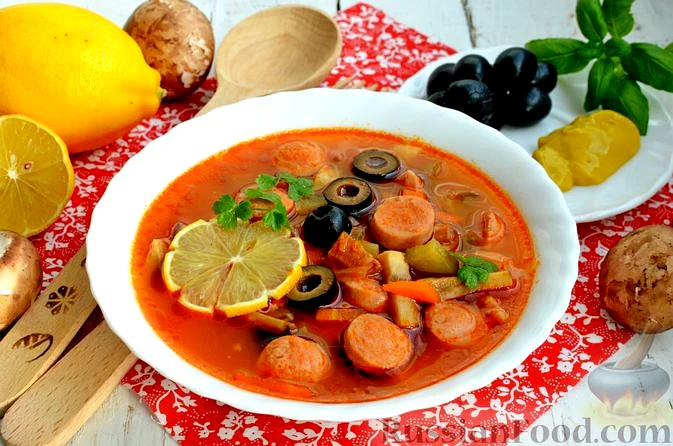 Рецепт Солянка з ковбасою та печерицями, склад: шинка (або копчена ковбаса), сосиски, печериці, огірки солоні, соус томатний, маслини чорні без кісточок, морква, цибуля ріпчаста, лавровий лист, сіль,…
