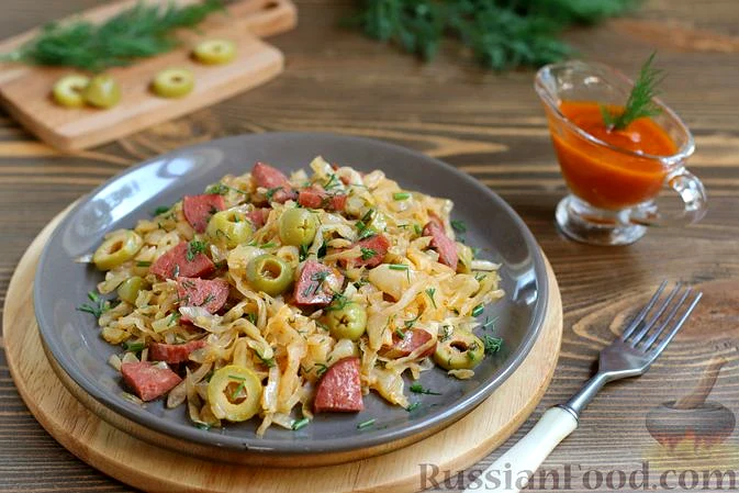 Рецепт Солянка з капусти з копченою ковбасою та оливками, склад: капуста білокачанна (невеликий качан), ковбаса копчена, цибуля-шалот, цибуля ріпчаста, часник, соус томатний, оливки без кісточок, зел…