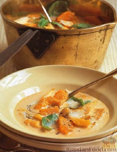 Рецепт Суп-пюре з батату з гарбузом і рибою, склад: батат, гарбуз горіховий, пікша, філе копчене, масло вершкове, цибуля ріпчаста (рубаний), вода, молоко, базилік, вершки жирні, сіль, перець чорний м…
