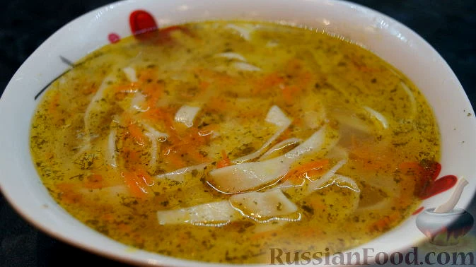 Рецепт Суп з домашньою локшиною, склад: курка, цибуля ріпчаста, яйця, борошно пшеничне, перець горошком, сіль велика; на 8 порцій