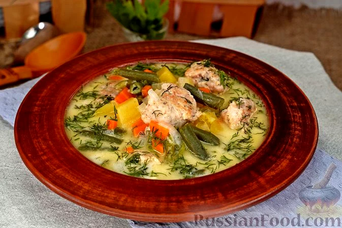 Рецепт Суп з фрикадельками, стручковою квасолею і плавленим сиром, склад: квасоля стручкова, фарш курячий, картопля, сир плавлений, цибуля ріпчаста, морква, селера черешкова, сіль, перець чорний меле…