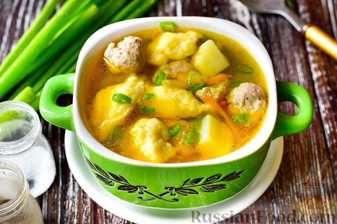 Рецепт Суп з галушками, фрикадельками та картоплею, склад: фарш свинячий, картопля, цибуля ріпчаста, морква, масло вершкове, лавровий лист, цибуля зелена, сіль, перець чорний мелений, вода; Для кліто…