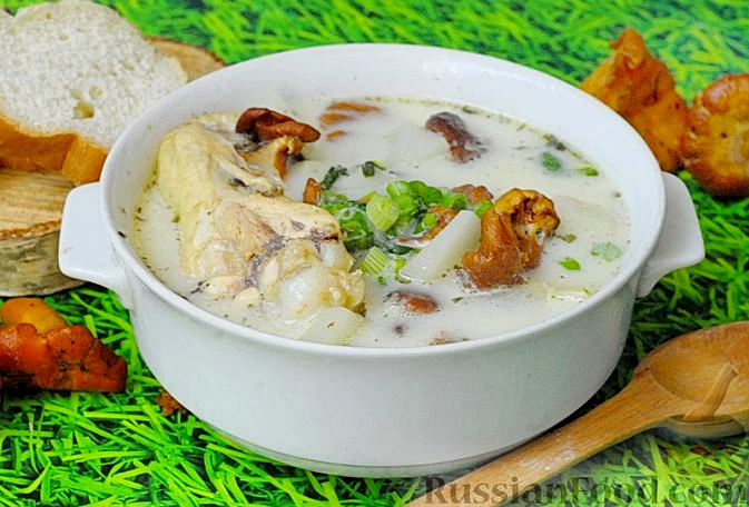 Рецепт Суп з лисичками, сметаною та пивом, склад: лисички, м'ясо куряче (будь-яка частина курки), пиво темне, картопля (2 шт.), сметана (0,25 склянки), цибуля ріпчаста (0,5 шт.), майоран сушений, пер…