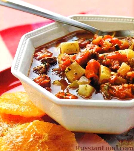 Рецепт Суп з м'ясом і картоплею, склад: стейк яловичий яловичий (різаний шматочками), помідори консервовані з зеленим чилі (рубані), картопля (різана кубиками), олія рослинна, цибуля ріпчаста (рубани…
