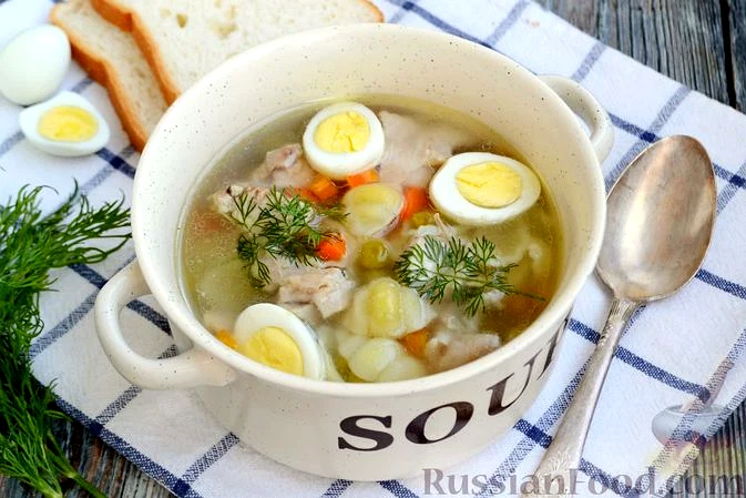 Очистіть перепелині яйця. Подрібніть зелень кропу. У кожну порцію супу додайте 2-3 половинки перепелиного яйця та подрібнений кріп.