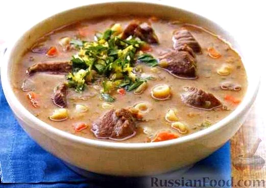 Рецепт Суп з ягнятини, склад: ягнятина (м'якоть, різана кубиками), квасоля консервована біла (промита), паста дрібна, коротка, олія оливкова, цибуля ріпчаста (рубаний), вода, перець чорний мелений; Д…
