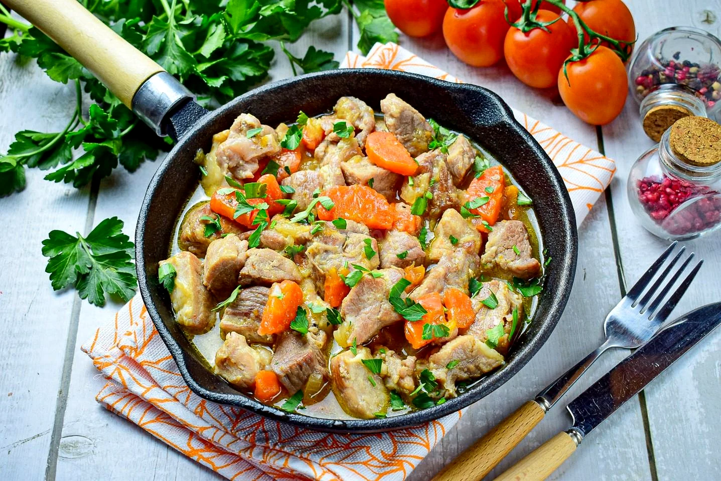 Свинина з цибулею та морквою на сковороді