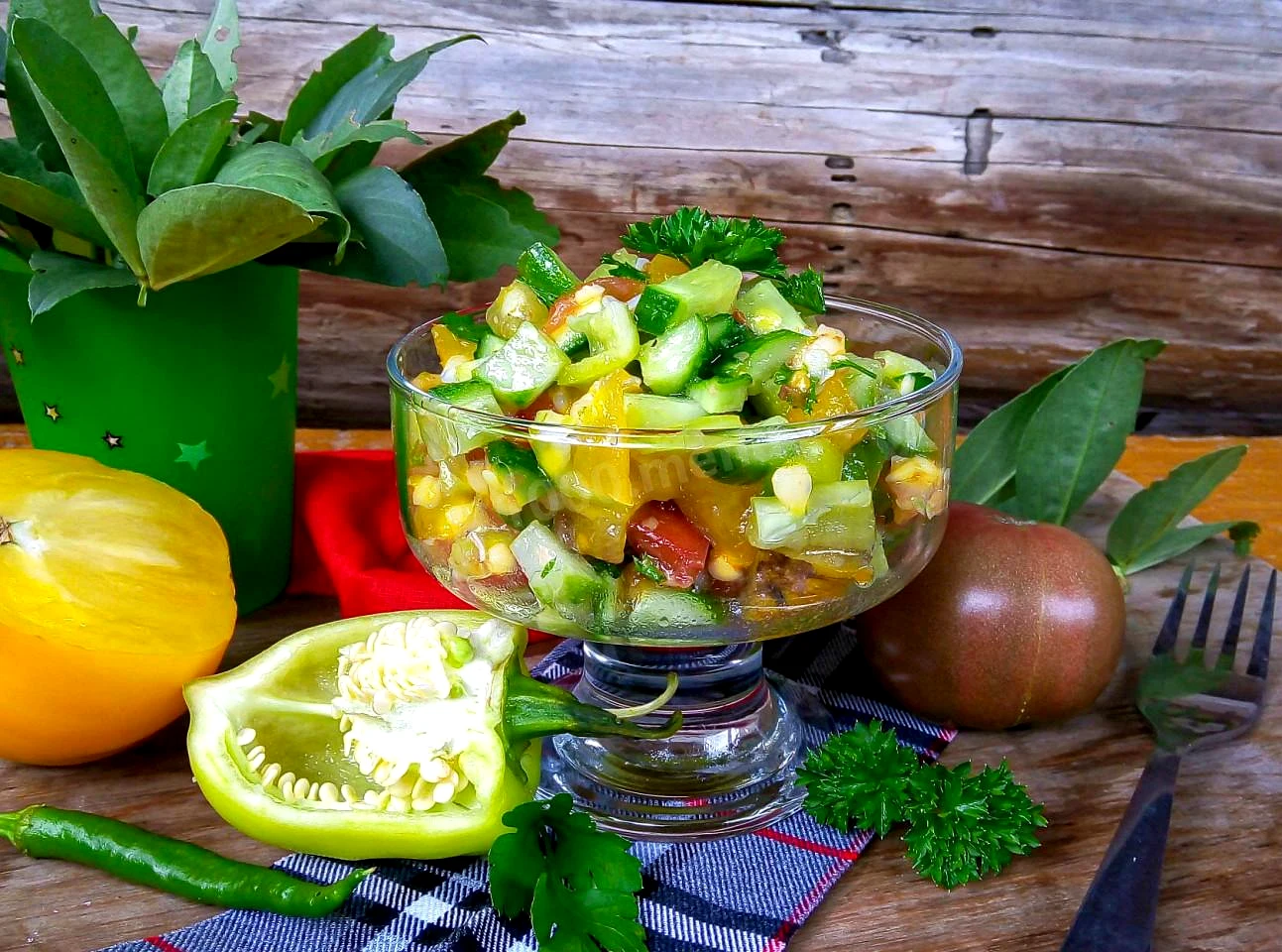 : Дрібно порубайте зелень Традиційно в салат кладуть багато зелені - кріп, петрушку, кінзу. Кому подобається м'ятна нотка в салатах зі свіжих овочів, може додати пару листочків свіжої м'яти.
