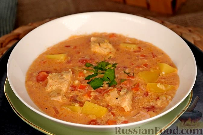 Рецепт Томатний суп з булгуром і плавленим сиром, склад: куряче філе, помідори консервовані у власному соку, картопля, цибуля ріпчаста, морква, сир плавлений, булгур, олія, сіль, перець чорний мелени…