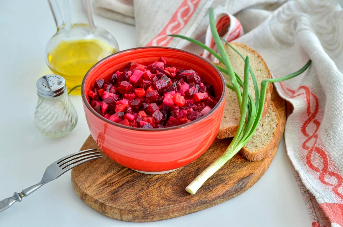 : Заправте вінегрет олією перед самою подачею, оскільки салати із заправкою швидше псуються. Вінегрет готовий. Викладіть його у салатник і подавайте на стіл. Приємного апетиту!