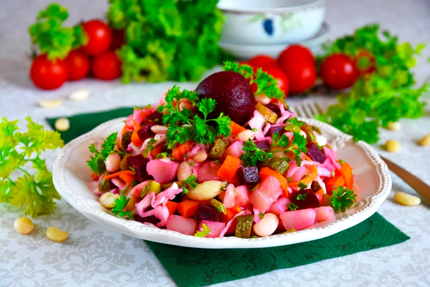 Приготуйте класичний вінегрет з квасолею та квашеною капустою — легкий і ситний салат з вареної картоплі, буряка, моркви та соленого огірка. Ідеальна закуска до обіду, заправлена рослинною олією з ар…