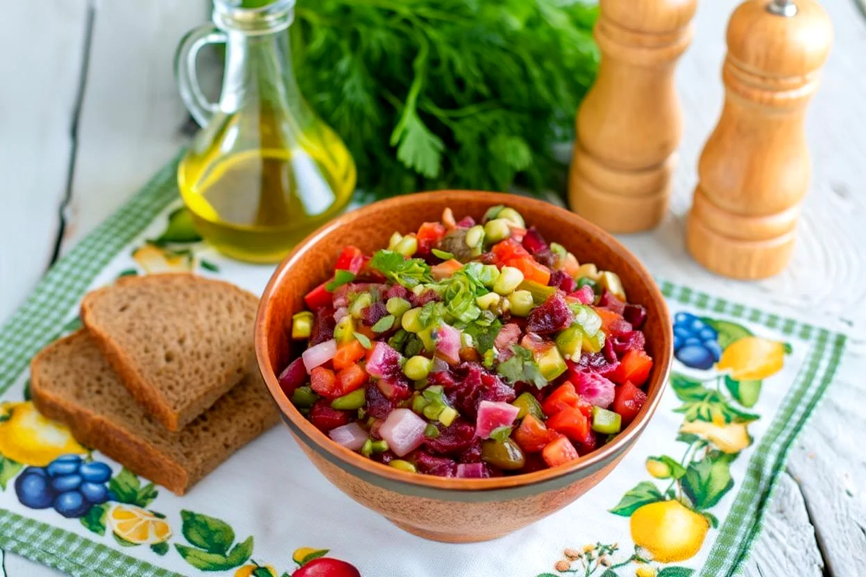 Приготуйте класичний вінегрет — яскравий, освіжаючий салат з молодої картоплі, морквою, бураком та хрусткими солоними огірками. Поєднання кислої квашеної капусти та зеленого горошку створює неповторн…