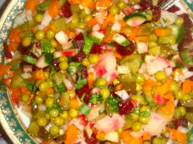 Приготуйте смачний вінегрет з буряка, картоплі, морквы та соленых огірків. Цей простий салат поєднує хрустке овочеве різноманіття з пікантним смаком маринованих огірків та свіжим зеленим горошком. Ід…