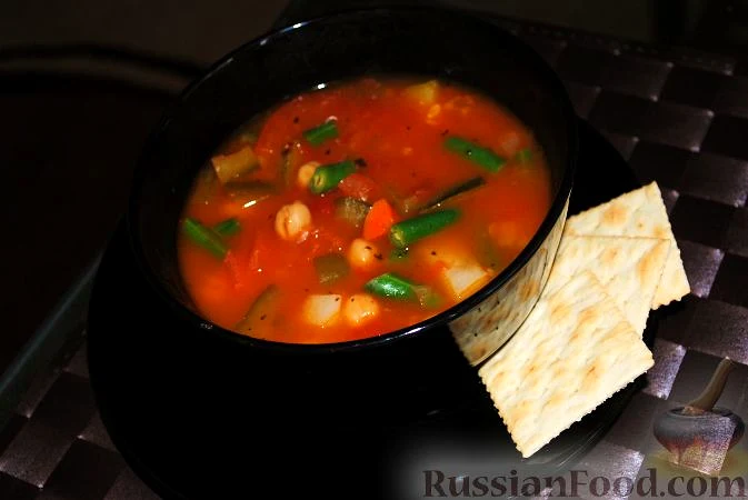 Рецепт Італійський супчик Мінестроне, склад: олія оливкова, цибуля, часник, селера черешкова, морква, кабачки, цукіні, перець болгарський зелений, сіль, перець чорний, орегано (материнка), квасоля ко…