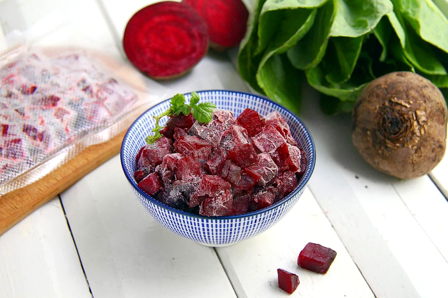 : Розкласти буряк по пакетах тонким шаром. У мене вийшла одна упаковка, якраз на одну порцію вінегрету. Вакуумуйте пакети під низьким тиском, високий вакуум перетворить м’які шматочки буряка в пюре. З замком-блискавкою просто закрийте блискавку. Наклейте на пакети наклейки із замороженою датою і помістіть їх у морозилку при температурі -18 градусів і нижче. Там заготовки зберігатимуться всю зиму.