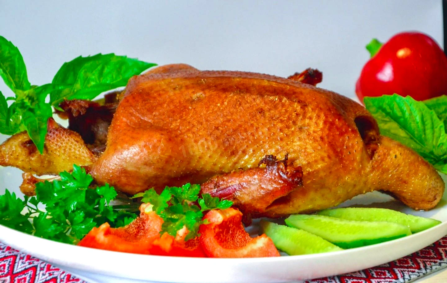 : Ось і готова наша качечка, аромат від неї приголомшливий! Цибулю з черевця викидаємо, він виконав свою роль, зробив м'ясо дуже ніжним. Викладіть птаха на гарну страву, прикрасьте свіжими овочами та приємного апетиту!