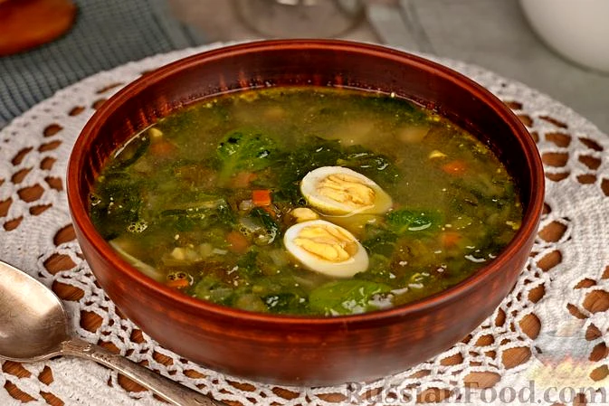 Рецепт Зелений борщ зі шпинатом, склад: картопля, шпинат, щавель, зелень петрушки, цибуля зелена, морква, цибуля ріпчаста, лавровий лист, олія рослинна, яйця перепелині (або 2-3 курячих яйця), сіль, …